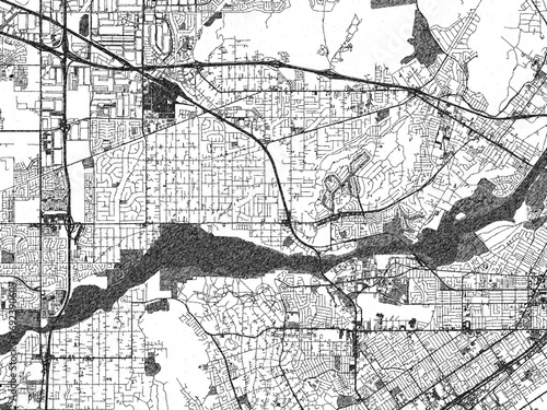 Naklejka premium Black and white illustration map of Jurupa Valley, California, showing its detailed urban layout in a hand-drawn style.