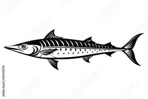 © kanchanrani, Naklejka premium Black and White Illustration of a Barracuda Fish with Distinct Markings and Sharp Fins