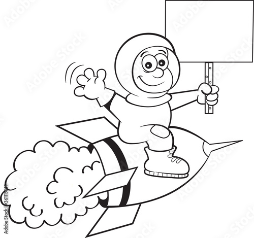 Fototapeta premium Black and white illustration of a boy in a space suit riding a space ship while holding a sign.