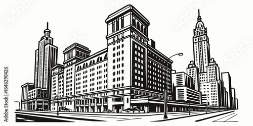 Fototapeta premium Black and white illustration of a cityscape with various buildings and street...