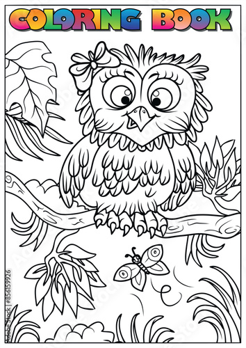 © juraj, Fototapeta premium Black and white illustration of a cute owl with a bow sitting on a branch, perfect for children's coloring books