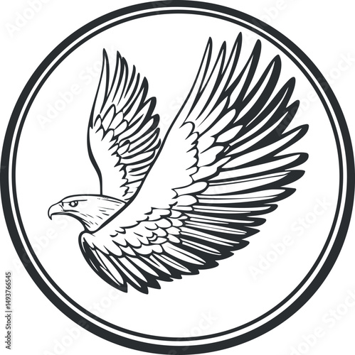 Obraz premium Black and white illustration of a flying eagle with spread wings inside a circular frame symbolizing strength and freedom