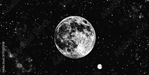 © wanna, Naklejka premium black and white illustration of a full moon with a black background