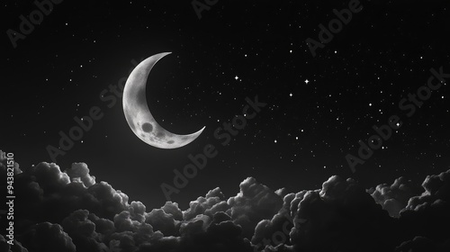 Fototapeta premium Black and white illustration of a night sky featuring a crescent moon in 3D...
