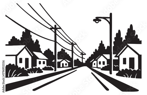 Obraz premium Black and white illustration of a quiet suburban street lined with houses and utility poles under a clear sky