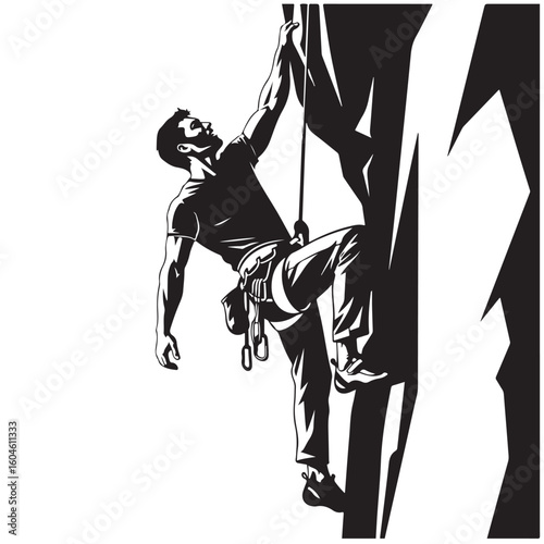 Fototapeta premium Black and white illustration of a rock climber scaling a cliff face, vector art