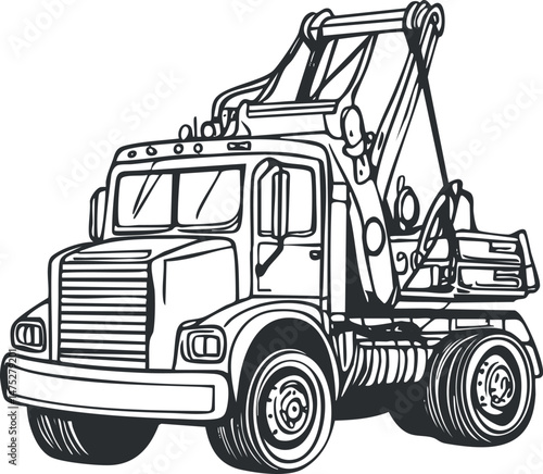 Fototapeta premium Black and white illustration of a tow truck with detailed lifting mechanism and wheels