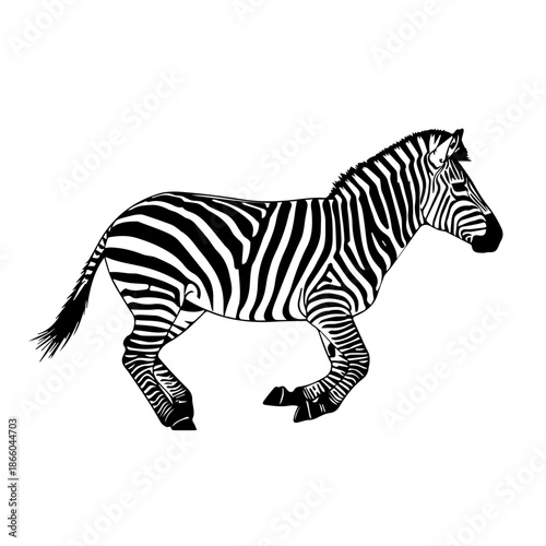 © Maulana, Obraz premium Black and white illustration of a zebra running or galloping in profile, showcasing its distinctive striped pattern.