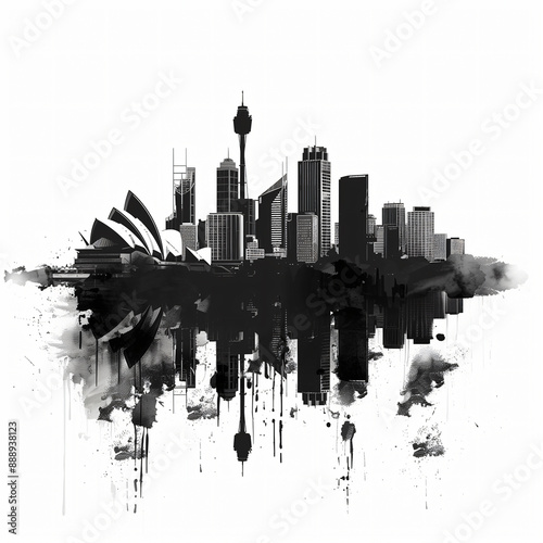 Obraz premium Black and white illustration of the sydney skyline reflecting in water with ink splashes