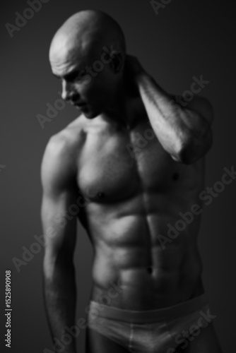 Fototapeta premium Black and white image of a muscular man striking a contemplative pose,...