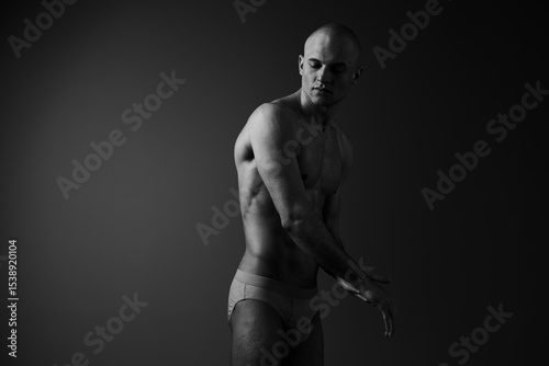 © SHOTPRIME STUDIO, Naklejka premium Black and white image of a thoughtful man, showcasing elegance and strength through body language and posture, evoking a sense of introspection.