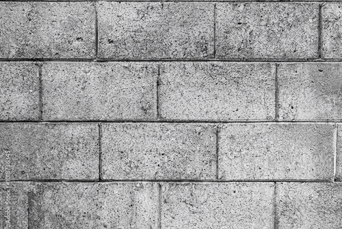 © Shariq .B, Obraz premium Black and white image of rough concrete block wall texture with visible wear and marks.