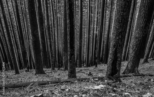 © Laura, Naklejka premium Black and white image of trees burned in a forest fire in Oregon's Columbia River Gorge.