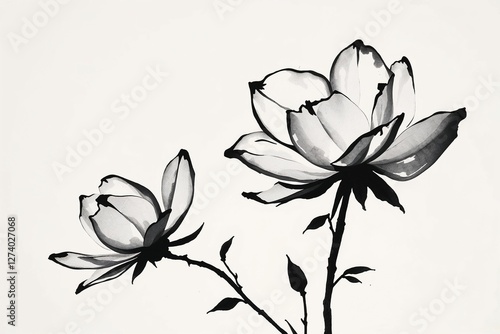 © Tondo, Obraz premium Black and white ink flowers on white background