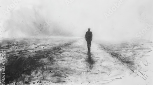 © Trichaiwat, Fototapeta premium Black and white landscape with a solitary figure walking on a foggy path