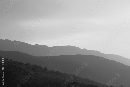 © yarbeer, Fototapeta premium Black and white landscape with mountains, sky and fog