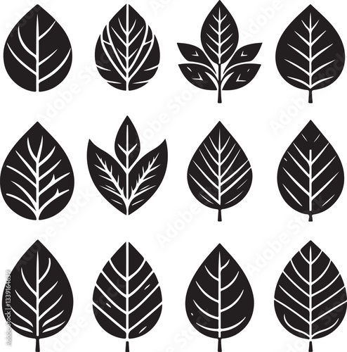 © Jihad, Fototapeta premium Black and white leaf icon silhouette vector set