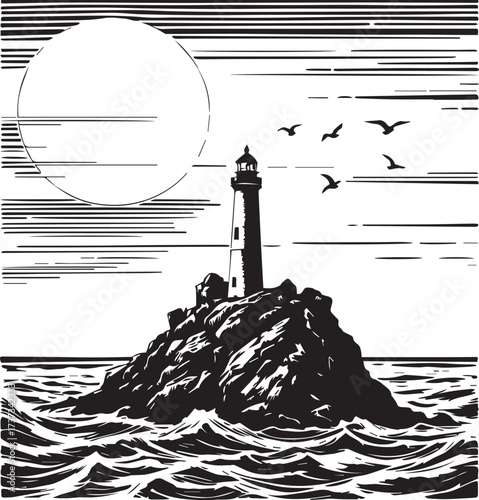 Fototapeta premium Black and white lighthouse illustration on rocky island with ocean waves...