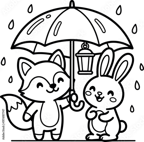 Obraz premium Black and white line art fox and rabbit holding umbrella with lantern in rain