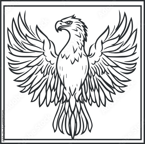 Obraz premium Black and white line art illustration of an eagle with spread wings inside a square frame