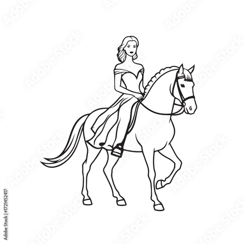 Fototapeta premium Black and white line art of a beautiful woman with perfect body riding horse elegant minimalist illustration