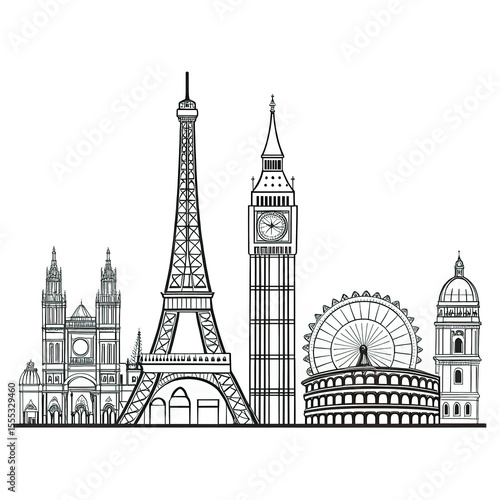© Hoseein, Fototapeta premium Black and White Line Art Skyline of European Cities - Travel Landmark Illustration