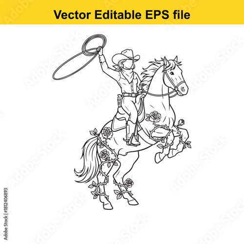 © ShahAlam, Obraz premium Black and white line art vector illustration of a cowboy riding a rearing horse decorated with roses, isolated on