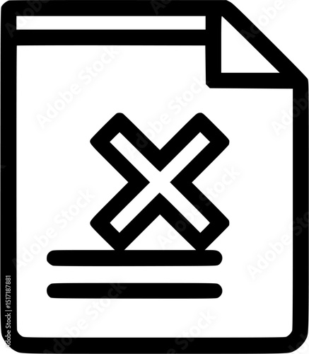 Fototapeta premium Black and white line drawing of a document with a folded corner X mark and...