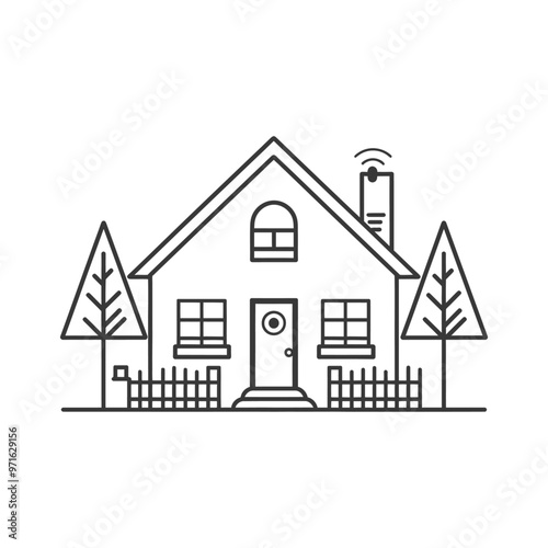 Fototapeta premium Black and White Line Drawing of a Smart Home with Trees and Fences