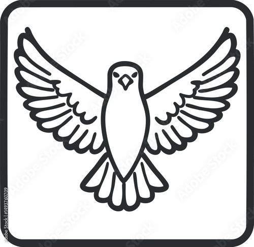 © Yana, Fototapeta premium Black and white line icon of a dove with wings spread wide inside rounded square frame symbolizing peace and freedom