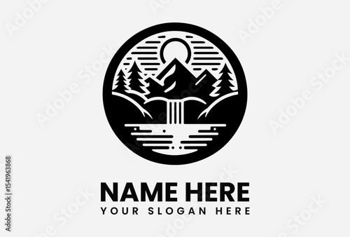 Fototapeta premium Black and white logo featuring a serene mountain landscape with a waterfall, sun, and trees, encircled within a circular frame.