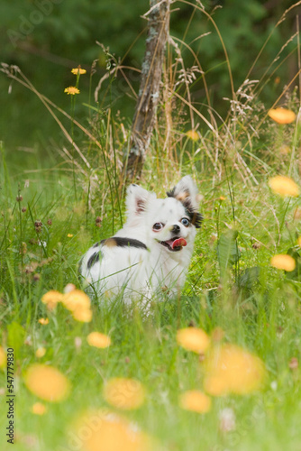 © Sonia, Fototapeta premium Black and white long hair chihuahua playing in the grass and dandelions in the sun. Small dog enjoying a summer day.