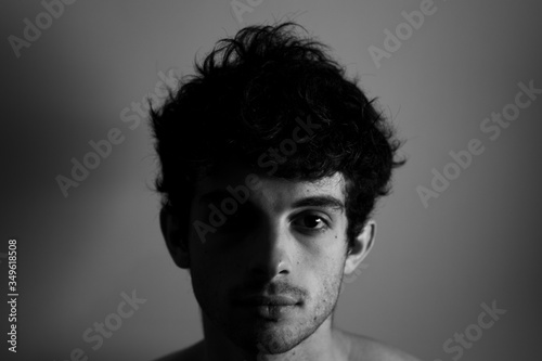 © PetitNuage, Fototapeta premium Black and white Man looking camera curly hair cute affraid