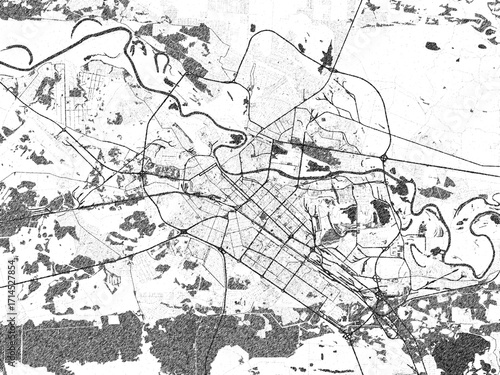 © W&S Stock, Fototapeta premium Black and white map poster of Tyumen, Russian Federation, illustrated in hand-drawn style.
