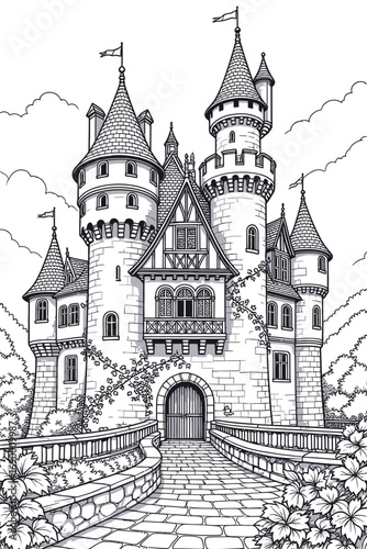 © Rinto, Fototapeta premium Black and white medieval castle illustration