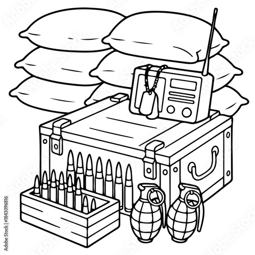 © CrazyJuke, Obraz premium Black and White Military Gear: A collection of military equipment including ammunition, grenades, a radio, and bedding, presented in stark monochrome.