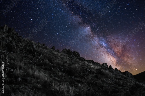 © Holo Frame, Naklejka premium Black and white mountain pattern set against a vibrant star-filled night sky