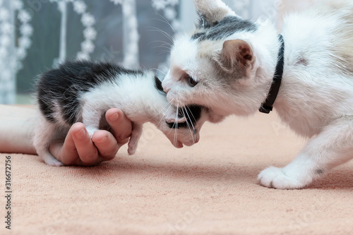 Fototapeta premium Black and white newborn kitten in a female palm, cat mom wants t