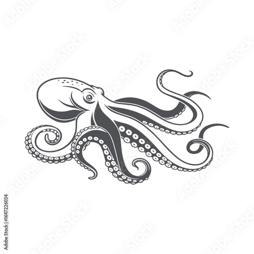 © Roman, Fototapeta premium Black and White Octopus Vector Illustration. Detailed Marine Cephalopod with Curled Tentacles Isolated on White Background