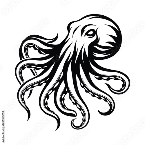 © Shipon, Obraz premium Black and White Octopus with Detailed Tentacles on Isolated Background
