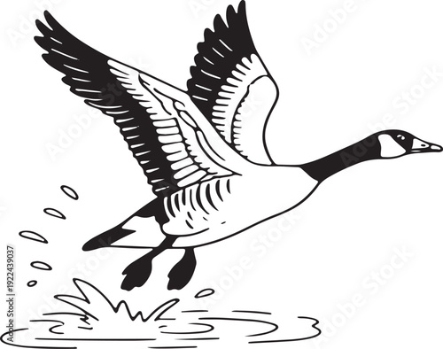 © Md.Al-amin, Obraz premium Black and white of a Canada goose taking flight from water bird flying
