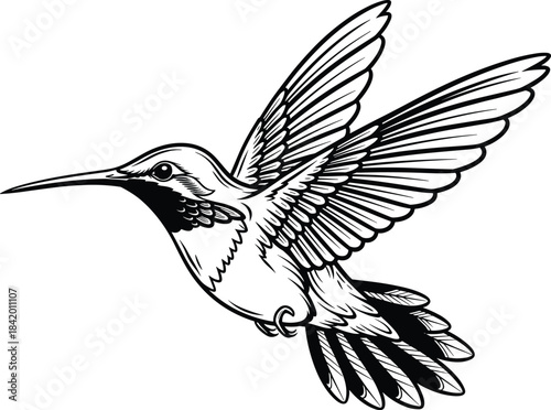 © Parvej Creatives, Fototapeta premium Black and White Outline Drawing of a Flying Hummingbird in Action with Rapidly Beating Wings, Hand-Drawn Vector Illustration for Nature, Wildlife, and Bird Concepts