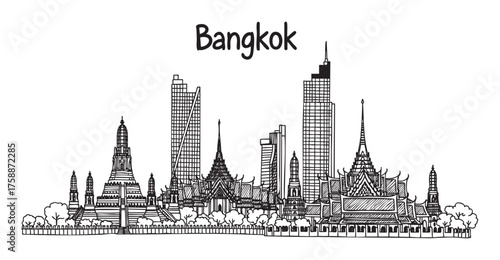 Naklejka premium Black and white outline of bangkok's skyline featuring iconic temples and...