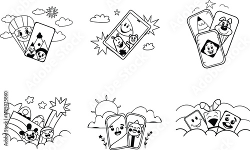 © Ahsan, Fototapeta premium Black and white outline set of smartphone cartoon characters in the sky illustration