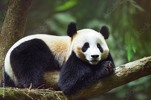 Fototapeta premium black and white panda on the background of green bamboo leaves, generative AI