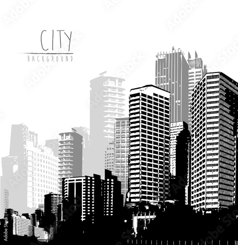 © pokki, Naklejka premium Black and white panorama of cityscape with place for your text.