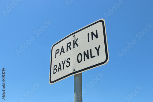 © Kim Britten, Obraz premium black and white Park in Bays Only sign in blue sky background