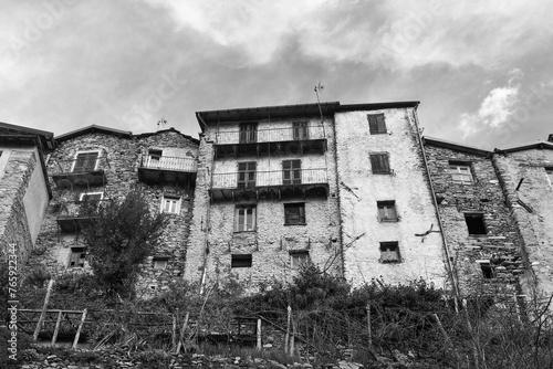 © Simona Sirio, Obraz premium Black and white photo. Low-angle view of medieval houses in the so-called "village of witches", famous for the witch trials dating back to 16th century, Triora, Imperia, Liguria, Italy