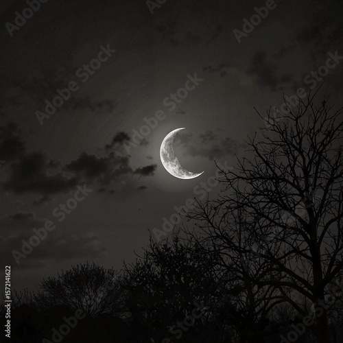 © Елена Сайкина, Naklejka premium Black and white photo of a crescent moon among clouds with bare trees on a dark background