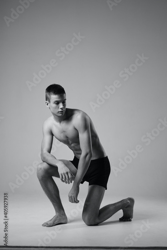 © SHOTPRIME STUDIO, Naklejka premium black and white photo of an athlete indoors in full growth on one knee